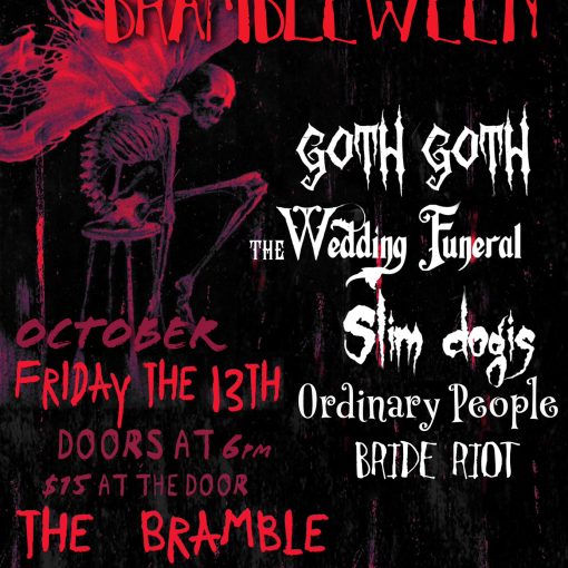BRAMBLEWEEN a Friday the 13th costume party at the Bramble House The Bramble, 400 S. Cummings Ave., Glassboro, NJ Costumes Encouraged! $15 Doors open 6:00 pm Performances by: GOTH GOTH / THE WEDDING FUNERAL / SLIM DOGIS / ORDINARY PEOPLE / BRIDE RIOT Facebook event page.