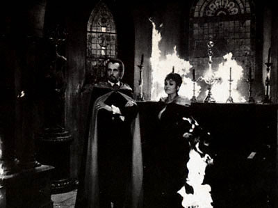 Hammer also did several tales based on Lefanu’s Carmilla. In Lust for a Vampire (1971), a pair of Satanist vampires resurrects Countess Karnstein. This is a still from the finale, wherein the Satanic chapel has been set ablaze by the local townspeople—those peasants were always revolting! The vampires have no fear, as fire cannot harm them. Note the black-draped altar, this time bearing an inverted cross between the black candles.