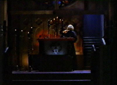Part of ABC Television’s Mystery Movie anthology series, this 1989 film featured Lou Gosset Jr. as an archaeologist who helped solve crimes (who had a daughter named Zeena!). It took its cue from Maury Terry’s book about the Son of Sam killings, and posited a New York area Satanic cult which sacrificed children to make snuff films. They met in a ruined church, the walls of which were covered with grafitti. Above is the main altar.