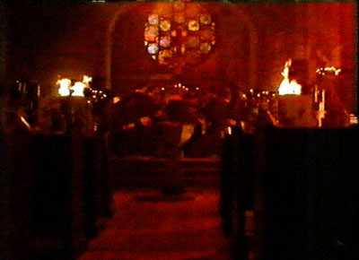 Above this altar hangs a large inverted cross, and before it a baptismal font is used for burning incense.