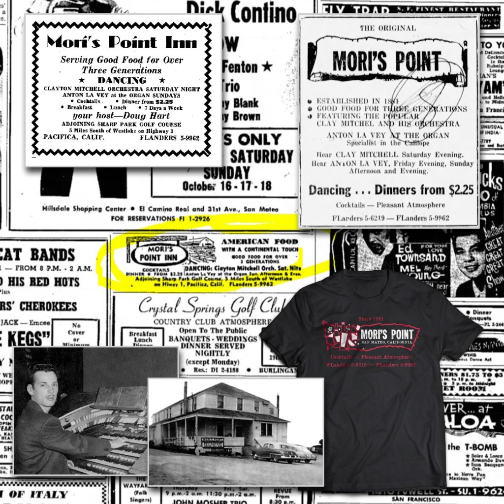 These performances are lost to time, but now you can recreate a memory like this with our souvenir-style t-shirt. Featuring a two-color, front and back design based on authentic promotional advertisements that ran in Bay Area papers in 1959. Don’t be a square, goose it down to Mori’s Point Inn and join the party!
