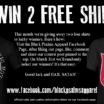 Black Psalms Apparel is currently giving away two FREE shirts to lucky winners! Please visit the Black Psalms Apparel facebook page, give them a like, and view their pinned post for more information about the sweepstakes. And while you’re there, check out their “shop now” button to view their line of snazzy Satanic themed shirts.