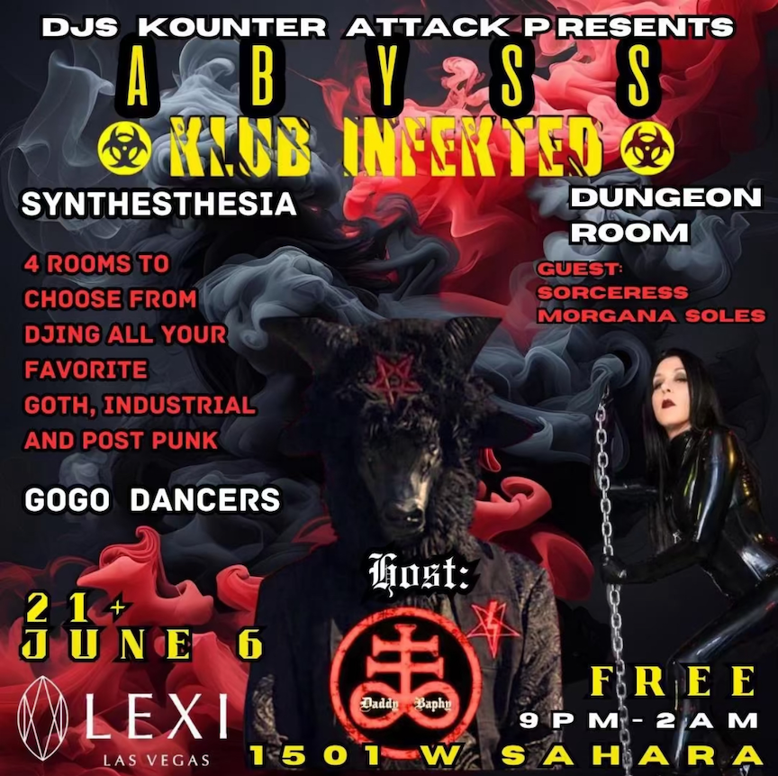 Join us at Club Lexi as DJ Kounter Attack presents ABYSS: CLUB INFEKTED. DaddyBaphy will host 4 rooms of musical onslaught playing all your favorite goth, industrial, and post punk in Las Vegas from 9pm-2am with free admission. Church of Satan resident demon of the black flame, DaddyBaphy will be wandering all four rooms available for pictures. Legendary Sorceress Morgana Soles will be handling duties in the dungeon.