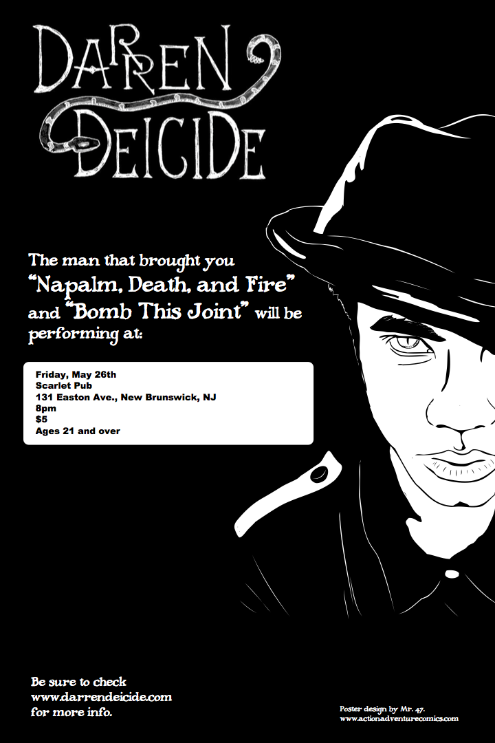 “If any proof is needed that the power of blues is easier to find than ever, look no further than Darren Deicide,” says The Aquarian Weekly. “Surprisingly rugged and rich…Darren Deicide brings more danger to rock n’ roll with a single blues lick and a few moments of your time than most contemporary bands do over the course of a tour,” says Jersey Beat, who goes on to say, “Darren Deicide’s music is akin to doing shots with the devil himself—it is more than a little frightening and you know the night will end badly, the question is just how badly.”