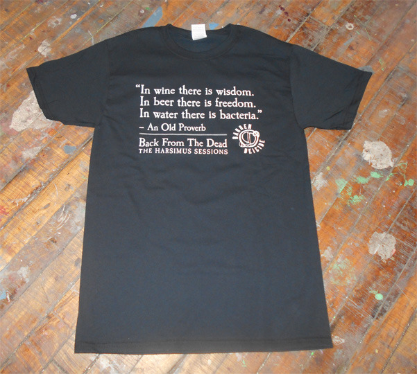 To celebrate the one year anniversary of the premiere of “Back from the Dead: The Harsimus Sessions”, “Back from the Dead: The Harsimus Sessions” shirts will be on sale for $5 only this month of February. T-shirts come in small, medium, and large size and sport the proverb “In wine there is wisdom. In beer there is freedom. In water there is bacteria.” They are available exclusively at here.