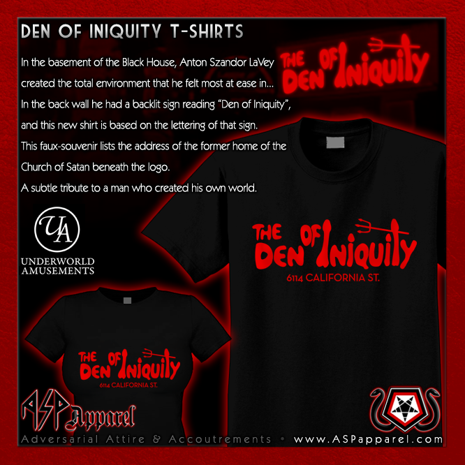 In the basement of the Black House, Anton Szandor LaVey created the total environment that he felt most at ease in: a seedy dive bar populated by the down and out. But those who populated it were literally his creations, as they were all meticulously crafted artificial humanoids. In the back wall he had a backlit sign reading “Den of Iniquity”, and this new shirt is based on the lettering of that sign. This faux-souvenir lists the address of the former home of the Church of Satan beneath the logo.