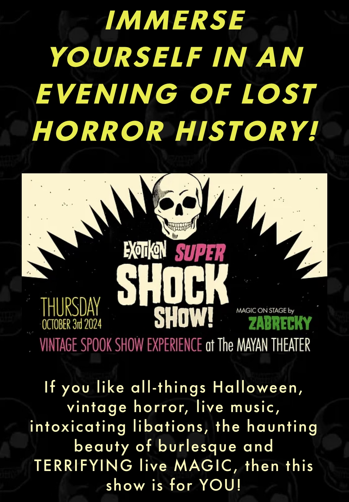 This is VINTAGE SPOOK SHOW EXPERIENCE to be held THURSDAY, OCTOBER 3rd at the MAYAN THEATER in Downtown Los Angeles. This 21+ event is a full evening running from 7pm to 11pm.