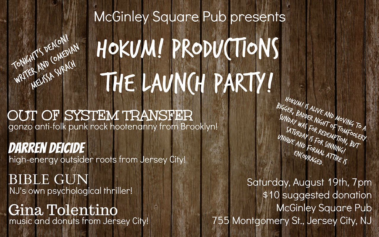Hokum! has transformed from a Sunday showcase into a production company, and the launch party is Saturday, August 19th in Jersey City. Doors are 7pm at McGinley Square Pub, and the launch party will feature Out of System Transfer, Darren Deicide, Bible Gun, and Gina Tolentino. The MC and guest deacon of the night is Jersey City writer and comedian, Melissa Surach. There is a $10 suggested donation.