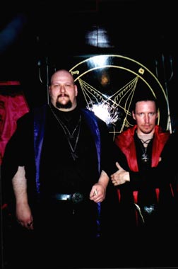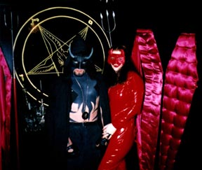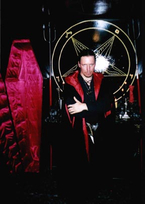 As the ritual opens the Celebrant stands before the altar. Pan is also crouched before the altar, but hidden in the shadows. The assistant stands to one side beside the gong. The Succubi are standing in closed, upright coffins flanking the altar, thus hidden from the congregation, who should enter after the stage is set.