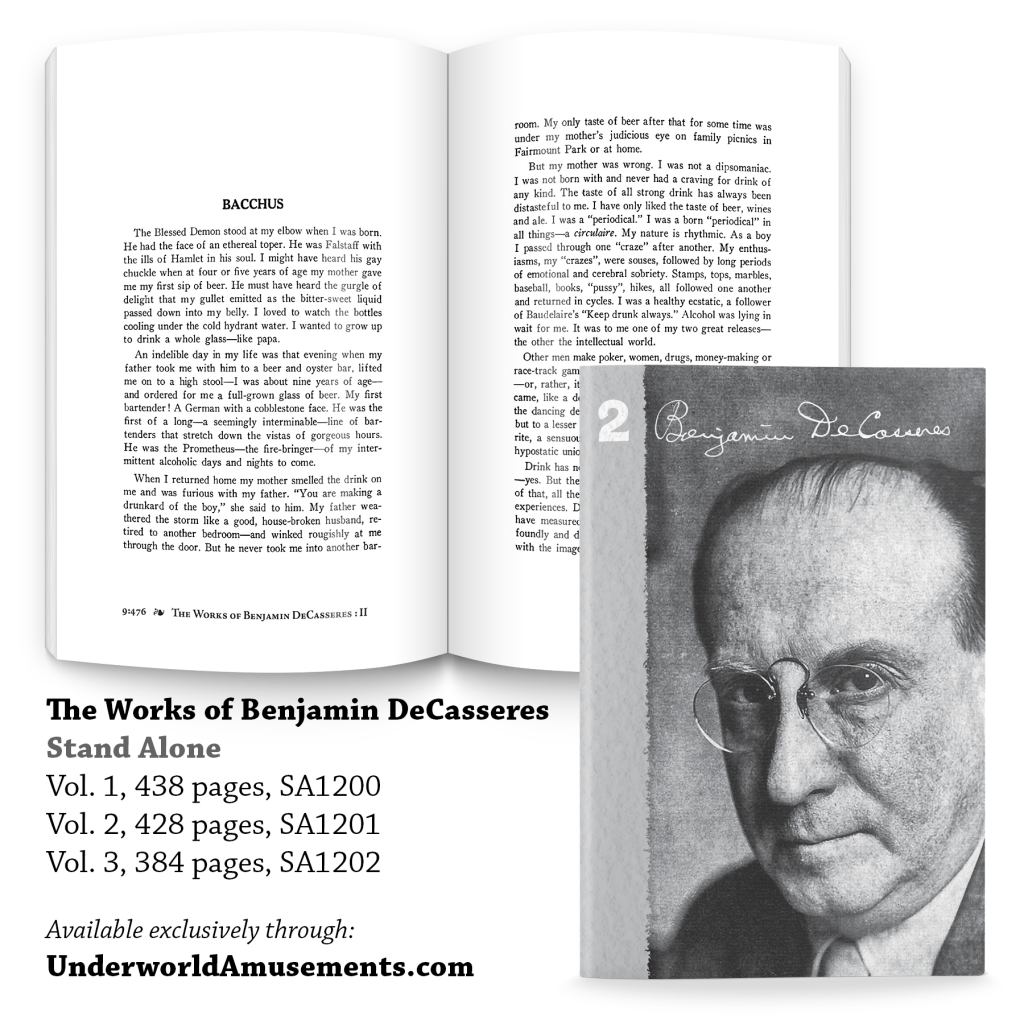 These booklets were bound into three volumes and released as The Works of Benjamin DeCasseres in a limited edition. This trilogy is being released as three issues of the Stand Alone journal project. This is a facsimile edition, with continuous folios and tables of contents added.