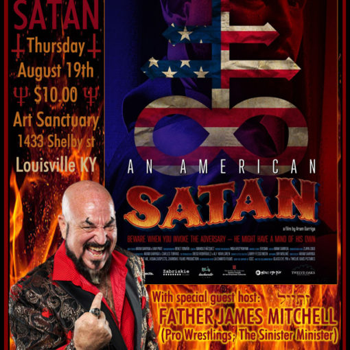 An American Satan, in its first public screening with host, Father James Mitchell (The Sinister Minister)! Art Sanctuary, 1433 South Shelby Street, Louisville, KY. Thursday, August 19, 2021 at 7 PM. $10 entry Tickets available through Showclix and at the door. 18+ entry / 21+ bar