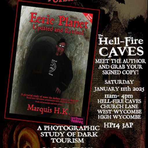 MARQUIS H.K. will be launching his latest book, EERIE PLANET—updated and revised—at the Hellfire Caves, West Wycombe, United Kingdom, on Saturday, January 11th, 2025, from 11am – 4pm. If you are a U.K. resident or visitor on that date, come and meet the author and obtain your signed copy!