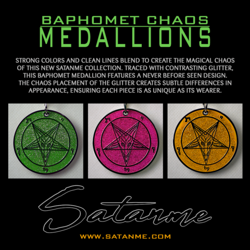 Baphomet Chaos Medallions Strong colors and clean lines blend to create the magical chaos of this New Satanme Collection. Traced with contrasting glitter, this Baphomet Medallion features a never before seen design. The chaos placement of the glitter creates subtle differences in appearance, ensuring each piece is as unique as its wearer.
