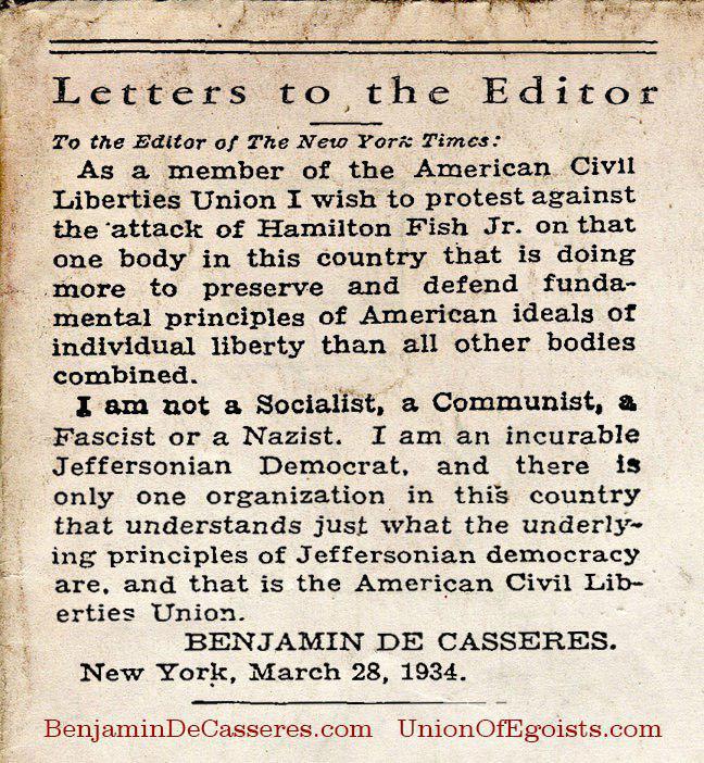 Magister Kevin I. Slaughter, historian of Benjamin DeCasseres and other egoist philosophers, passes along this 1930s letter from that old Imp to the New York Times, which today just published an op-ed asking the ACLU to take a