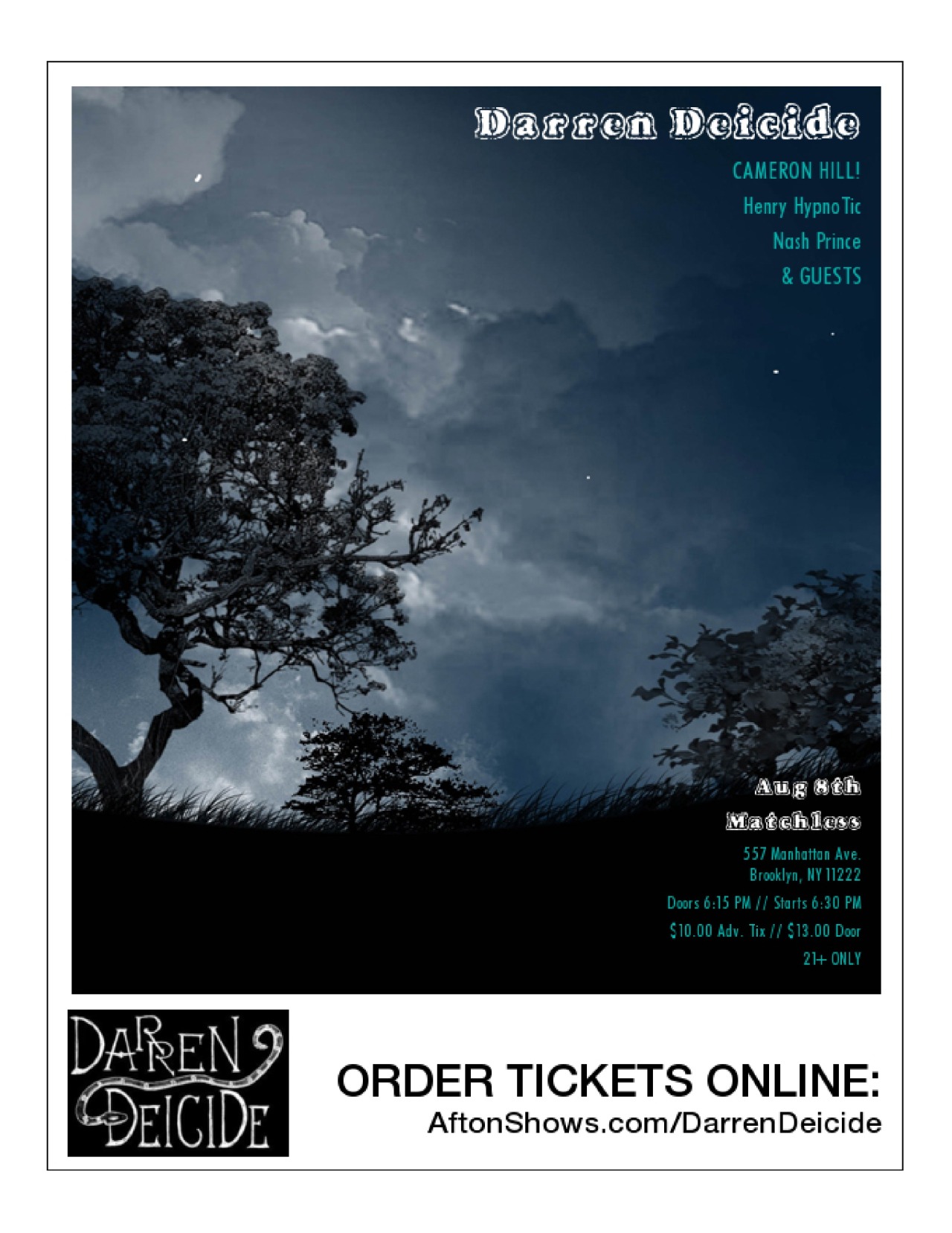 Thursday, August 8th, 2013, Afton Shows presents a showcase of heavy Americana featuring Darren Deicide.  The showcase will take place at Matchless in Brooklyn, NY and tickets are for sale in advance.  Buy your ticket by this Sunday for $7, in advance for $10, and at the door for $13.  Tickets can be put on will call by contacting [email protected], or go to https://tickets.aftonshows.com/DarrenDeicide.