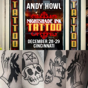 Reverend Andy Howl will be guest tattooing in Cincinnati, OH at Nightshade Ink Tattoo, December 28 & 29. Andy will be doing his highly collected Satanic flash tattoo designs, including the stylized devil shadow puppet designs he has become known for in Florida. Andy will also be doing select small to medium size custom tattoos on a case by case basis. Appointments are limited. To request a booking email [email protected] or DM him on Instagram @andy.howl