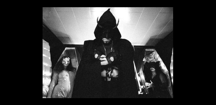 As the ritual opens the Celebrant stands before the altar. Pan is also crouched before the altar, but hidden in the shadows. The assistant stands to one side beside the gong. The Succubi are standing in closed, upright coffins flanking the altar, thus hidden from the congregation, who should enter after the stage is set.